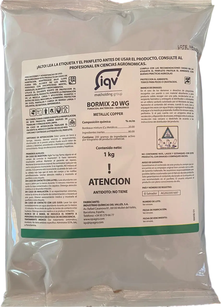 Con una formulación avanzada a base de cobre metálico, BORMIX 20WG es un fungicida y bactericida inorgánico de acción protectora y de efecto prolongado, diseñado para diversos cultivos. Su acción por contacto lo convierte en una solución eficaz contra una amplia gama de enfermedades que afectan tanto hortalizas como frutales y cultivos industriales.